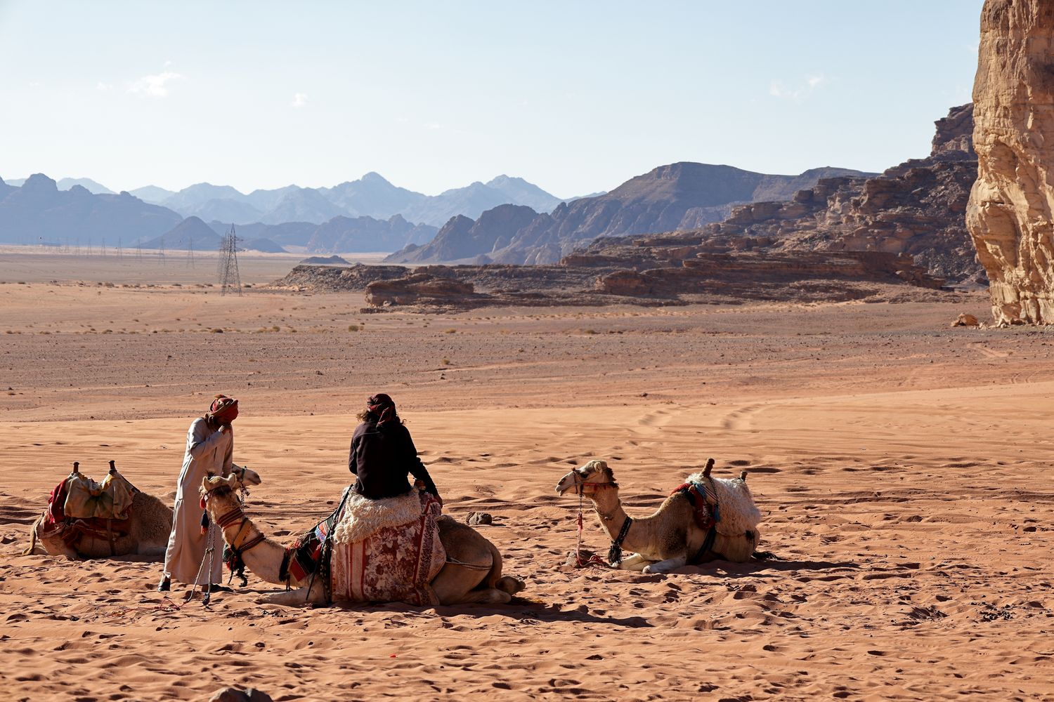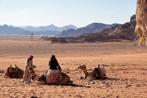 Wadi Rum Desert Camels with Jordanian taking care, Jordan, Western Asia